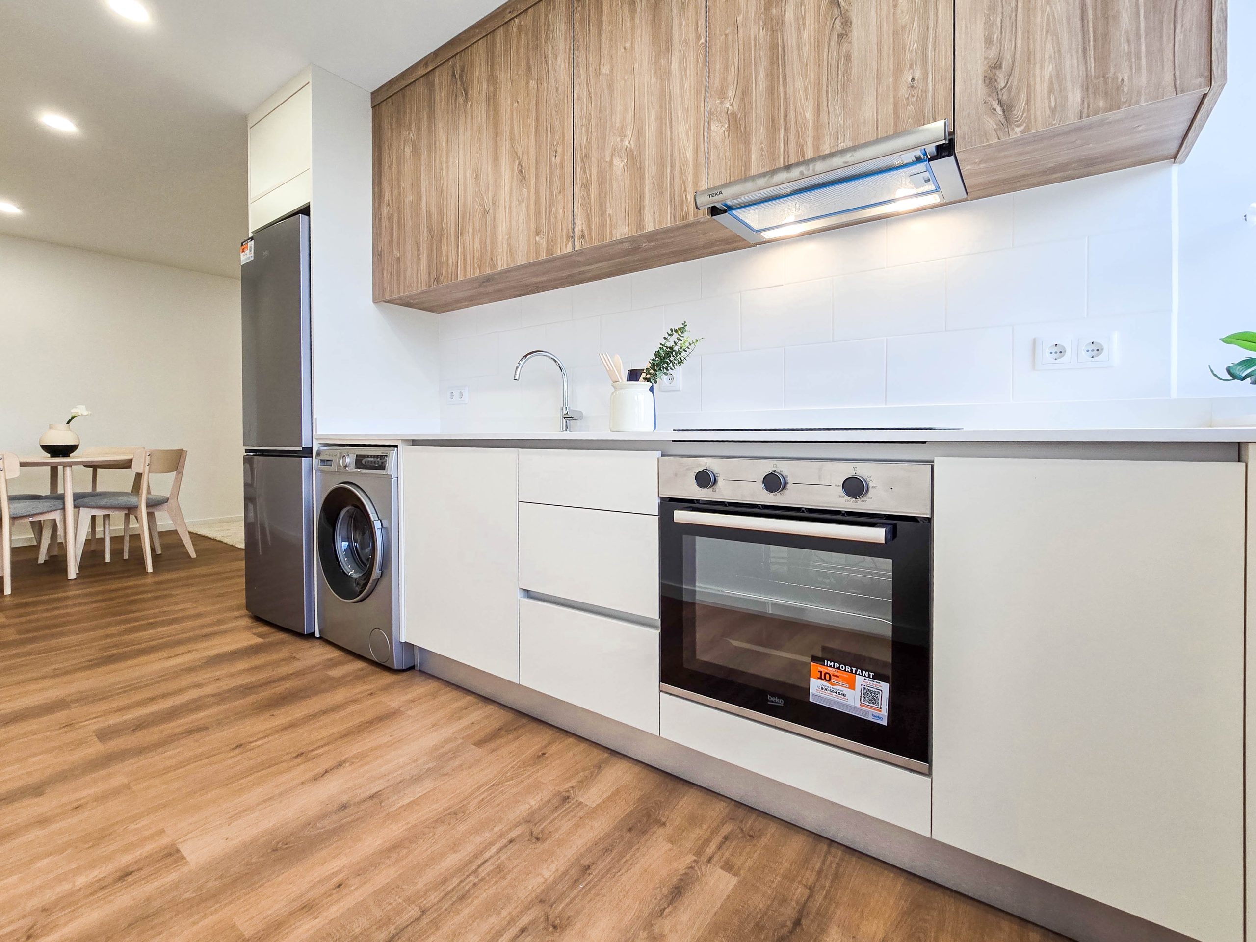 Cozinha equipada com forno, placa, exaustor e termoacumulador